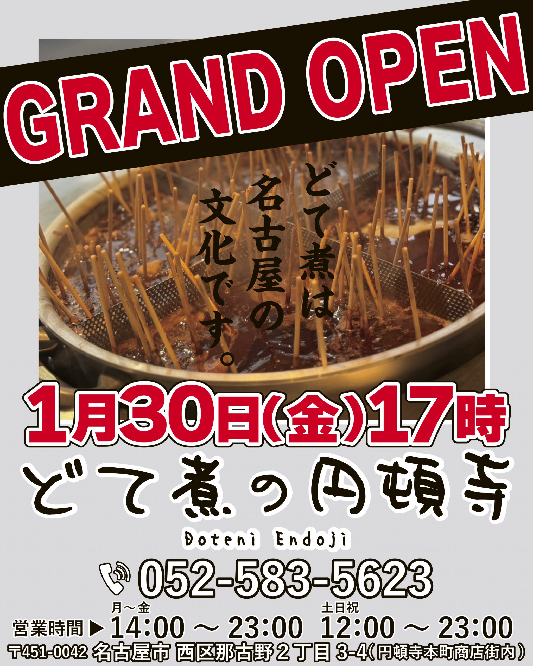 どて煮の円頓寺▼△グランドオープン△▼公開日:2026年1月29日更新日:2026年2月24日 ――新店舗のお知らせ―― どて煮の新店舗 どて煮の円頓寺 が1/30(金) 17:00~ グランドオープンします♪♪ ご来店お待ちしております♪ オープニングスタッフ募集中です♪ どて煮の円頓寺 公式instagram☟ https://instagram.com/doteni_no_endoji 住所:〒451-0042 愛知県名古屋市西区那古野2丁目3-4 営業時間:(月~金)14:00~23:00 (土日祝)12:00~23:00 電話番号:052-583-5623